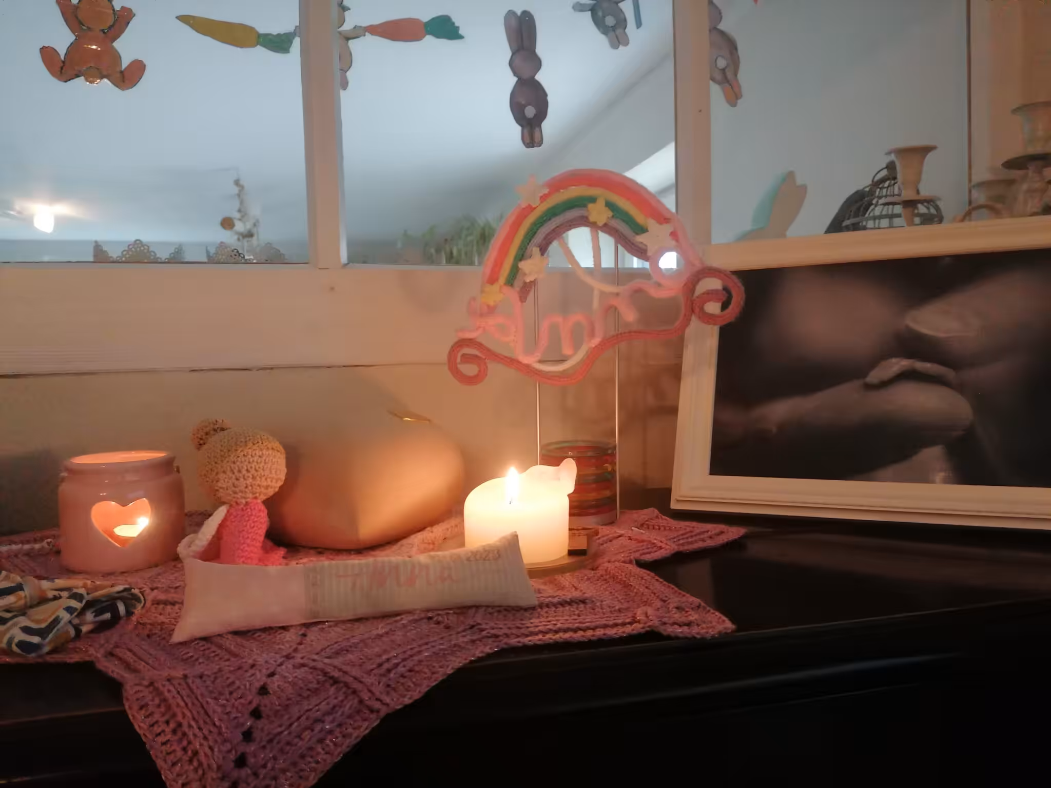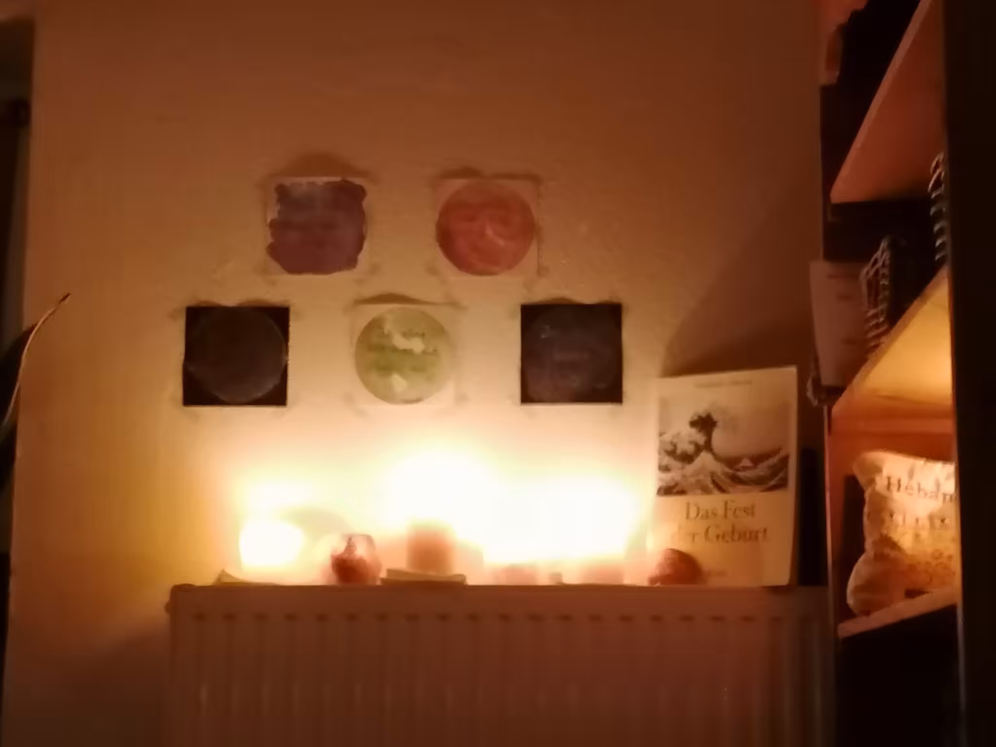 Das Wohnzimmer hab ich mir zu Geburtshöhle vorbereitet, im Regal ist alles für die Geburt bereitgestellt – Geburtsöl, Kamm, Sachen fürs Baby wie z.b. rotes Handtuch, Decke, Mützchen etc. Sachen für die Lotusgeburt, Sachen für mich danach zum anziehen…Meine Affirmationen hab ich schön gemalt und an die Wand gehängt und Anna ist auch mit „dabei“ – ihre Urne und Erinnerungsgegenstände haben wir ja auf dem Klavier.