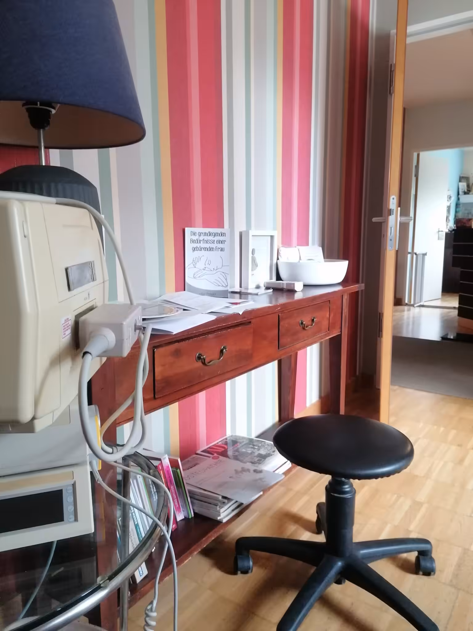 Ca. um 11 Uhr kommt Inge mit einer Schwesternschülerin bei uns an. Ich kann ihr nur kurz vorjammern, dass mein Pool kaputt ist und ich nicht weiß, wie ich ohne Wasser ein Kind kriegen soll. Wir wollen die Herztöne mit dem Dopton hören, dafür soll ich zwischen den Wellen kurz vom Ball aufstehen. Chris hält mich von hinten, aber es ist mega unangenehm, im Stehen Wellen zu veratmen. Wie zum Teufel laufen andere Frauen unter der Geburt herum oder bekommen ihre Kinder im Stehen? Für mich ein absolutes Rätsel…