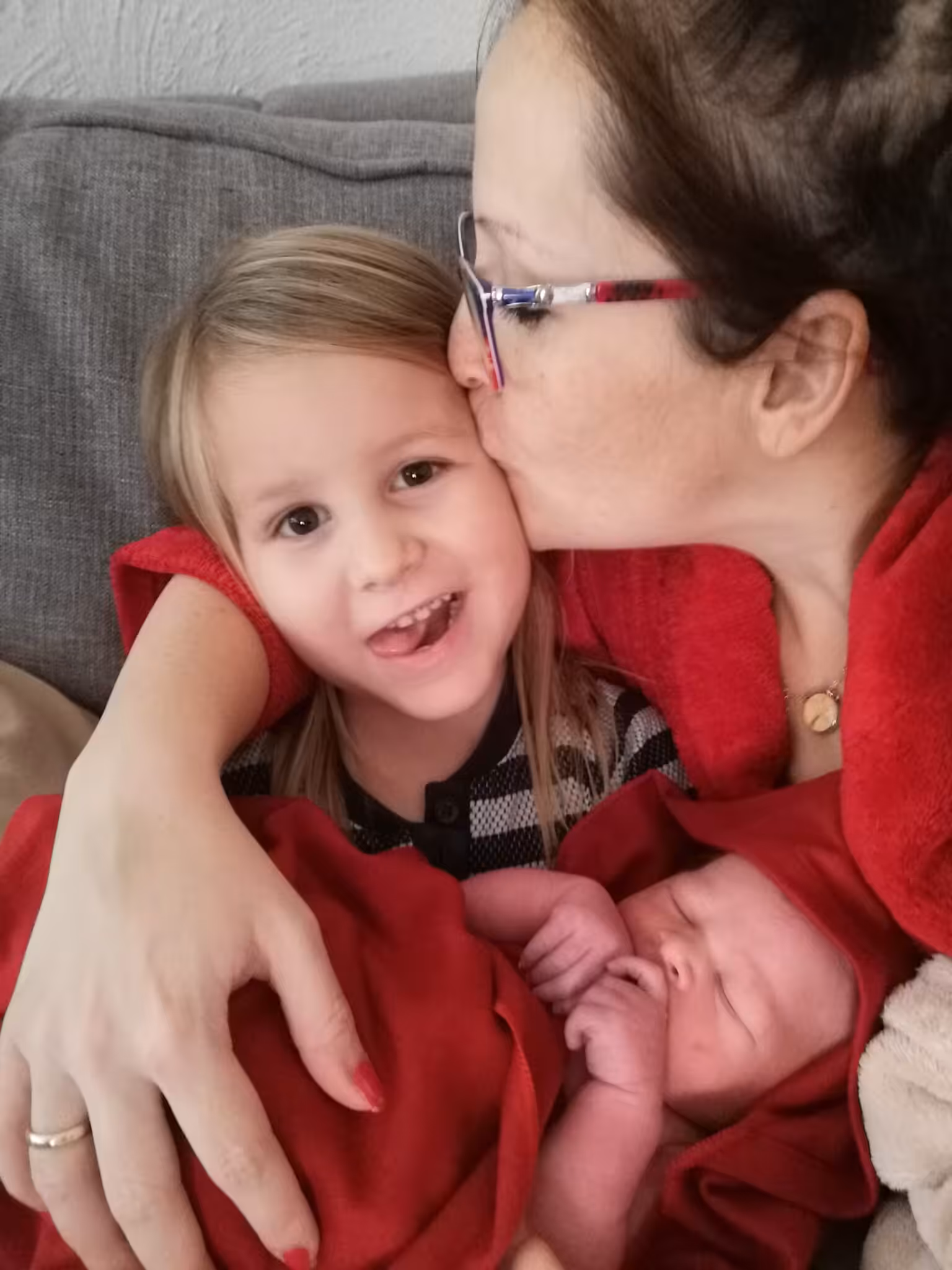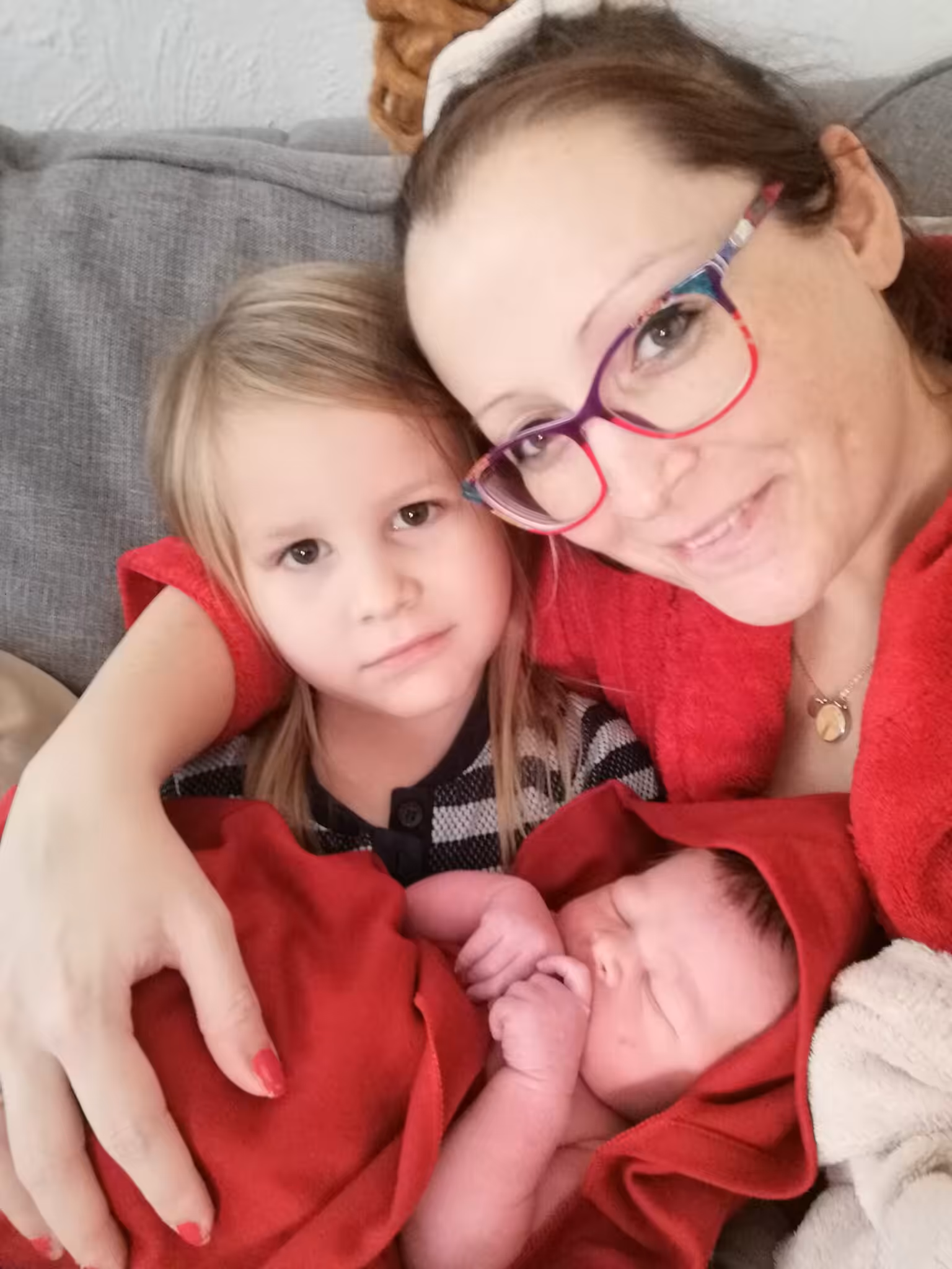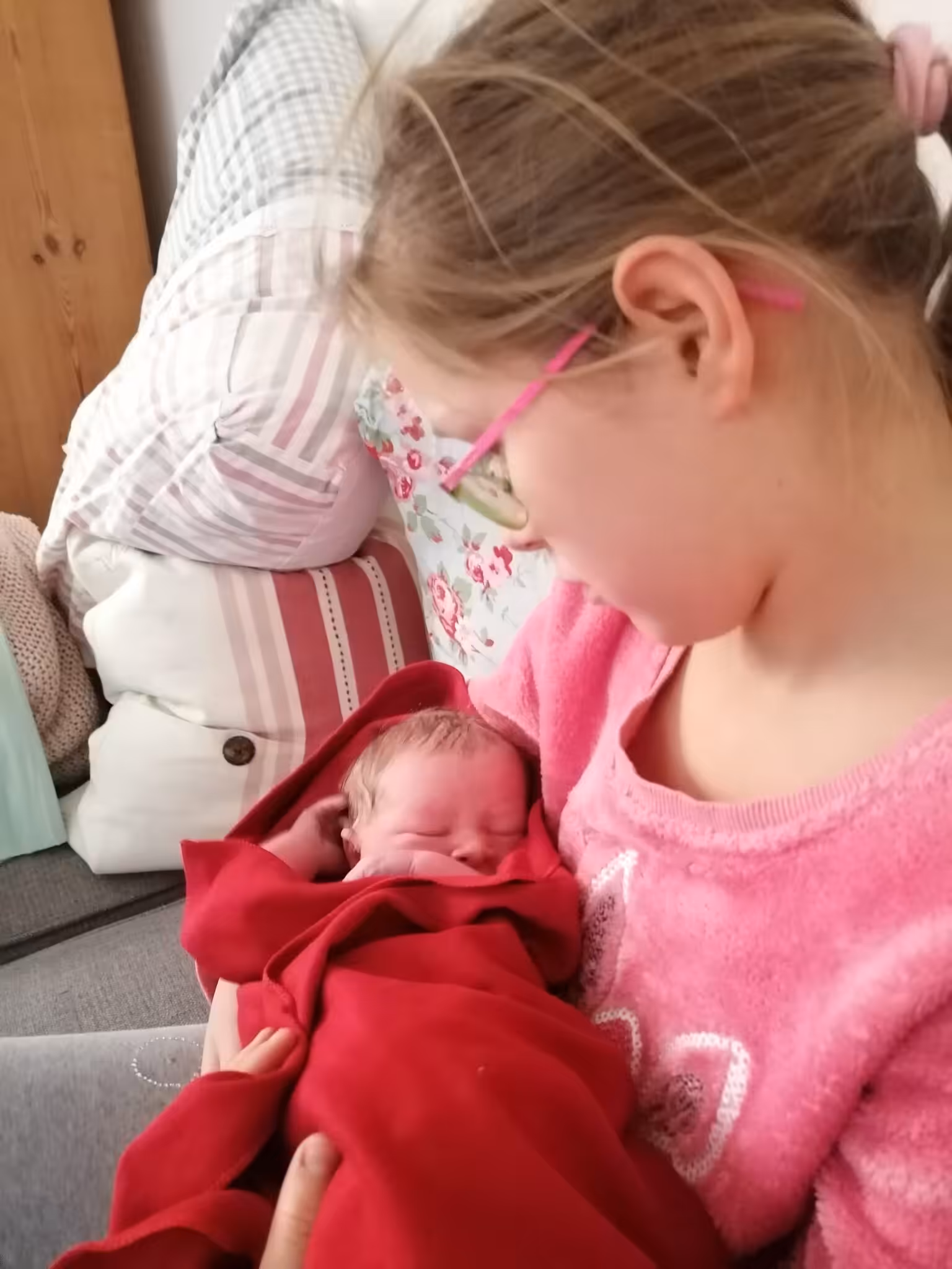 Alle stehen um den Pool rum und heißen ihren kleinen Bruder Willkommen. Ich sage „Willkommen im Irrenhaus, kleiner Luca!“ Seine Geschwister bestaunen ihn und seine kleinen Händchen und Füßchen. Wir haben uns ja auch diesmal wieder überraschen lassen, ob es ein Mädchen oder ein Junge wird. Deshalb hatte ich direkt nachgeschaut, was wir geschenkt bekommen haben. Diesmal gibt´s keine Komplikationen wie z.B nicht pulsierende Nabelschnur. Trotzdem können wir den Moment nicht ausreichend auskosten: Eigentlich würde ich gern die Plazenta auch wieder im Pool gebären, doch Inge muss fahren. Denn im Geburtshaus ist eine junge Hebamme, die noch keine Geburt allein begleitet hat und dort gehts schnell voran.Inge möchte es zur Geburt noch schaffen. Deshalb möchte sie, dass ich aus dem Pool komme. Sie animiert mich dann dazu, die Plazenta aktiv heraus zu drücken, um mich dann mit Baby auf die Couch zu verfrachten. Im Nachhinein betrachtet hätte ich wohl drauf bestehen sollen, dass wir im Pool bleiben und sie ruhig schon fahren kann…Hmmm aber klar wollte sie die Geburt zu Ende bringen unter ihrer Aufsicht…