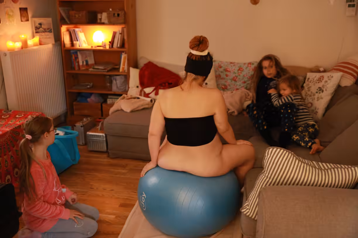 Aber ab da, wo ich endlich im warmen Wasser sitzen darf, bin ich wieder mehr „da“ und „Herr bzw. Frau meiner Lage“ und kann mich besser dran erinnern. Die Wellenabstände wurden erstmal wieder größer, typisch für Geburt im Wasser. Mattis erzählt ziemlich viel, er kaut Inge ein Ohr ab. Ich merke, dass ich ein bisschen Ruhe bräuchte und bitte ihn mehrmals, leise zu sein. Zu keinem Zeitpunkt aber würde ich eins meiner Kinder missen wollen, es ist einfach schön alle dabei zu haben. Emma ist auch auf der Couch und schaut zu. Nik sitzt gegenüber und schaut auch zu, das weiß ich allerdings nur von den Fotos. Ich taste (zum ersten Mal, bei keiner anderen Geburt habe ich getastet) und spüre die Fruchtblase prall ein bisschen herausschauen. Ich spiele mit dem Gedanken, sie zu öffnen, die Vorstellung ist schon sehr verlockend. Deshalb frage ich Inge auch danach, beantworte mir aber quasi meine Frage auch direkt selbst, dass es keine gute Idee ist… Ja ich weiß es ja, man lässt sie schön in Ruhe. Mattis kam nicht umsonst in der intakten Fruchtblase, er hat den Schutz vielleicht bis zum Schluss gebraucht… Ich schiebe tlw. schon ein bisschen mit, versuche es zumindest…